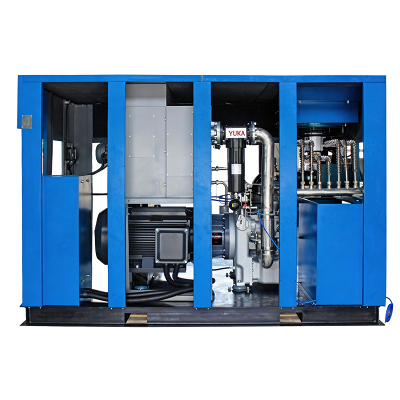 A dry-type oil-free screw air compressor utilizes a screw rotor structure that requires no lubrication during the compression process, resulting in absolutely oil-free output air.
